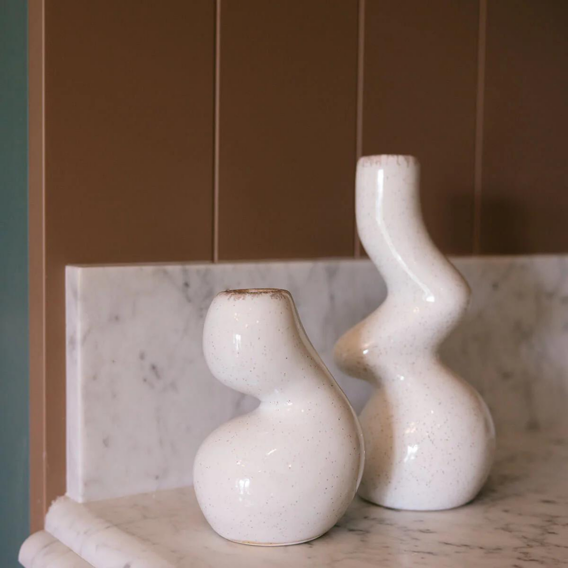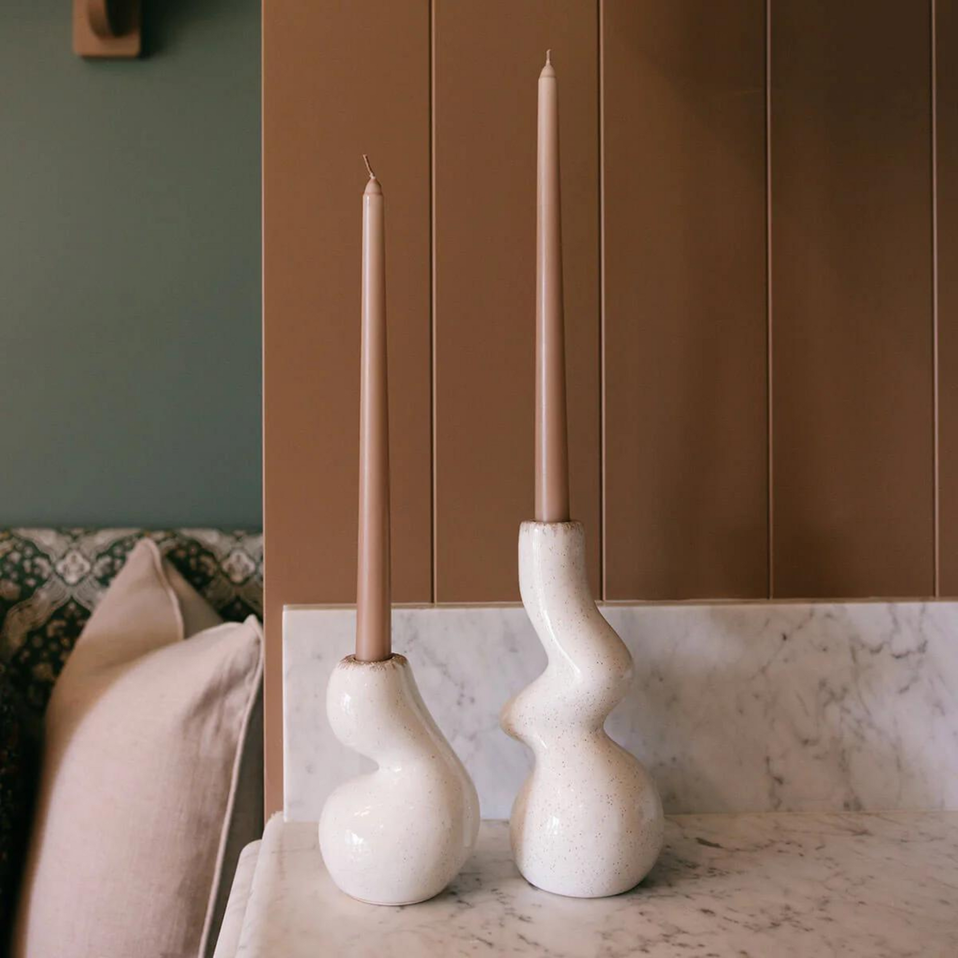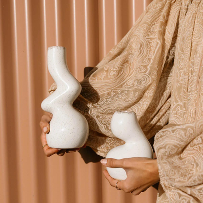 Create a harmonious balance in your space with our Gia Candle Holder Set, a duo designed to complement each other while adding depth to your decor. Each holder in this set features the same stunning glossy finish and reactive glaze in a speckled oyster shade, yet with subtle variations that make them uniquely yours. Their classic yet contemporary design allows them to blend seamlessly into any decor style, from modern minimalism to rustic chic. Use them together for a cohesive look, or place them separately to bring a touch of elegance to multiple rooms in your home.