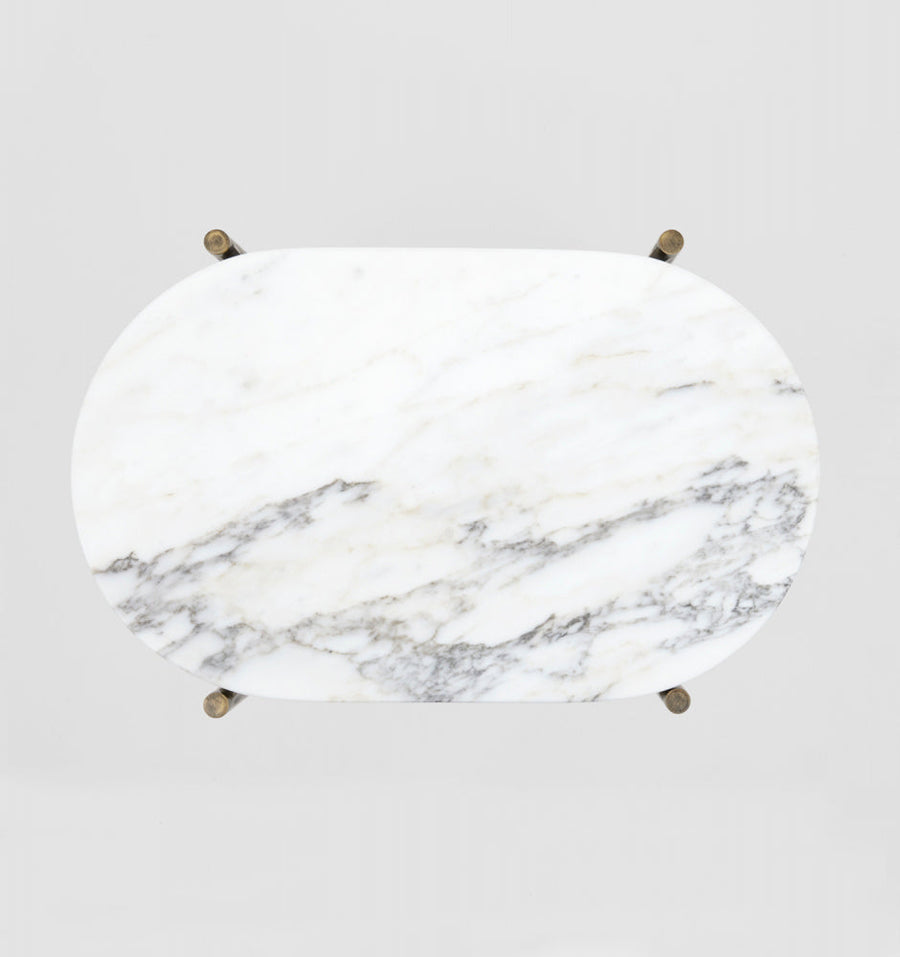 The Rhonde series by Middle of Nowhere is a range of simple, functional occasional tables that celebrate the natural beauty of marble. This Rhonde marble table has a brass look steel base, paired with an oval top featuring white marble swirled with grey, honey and beige tones.